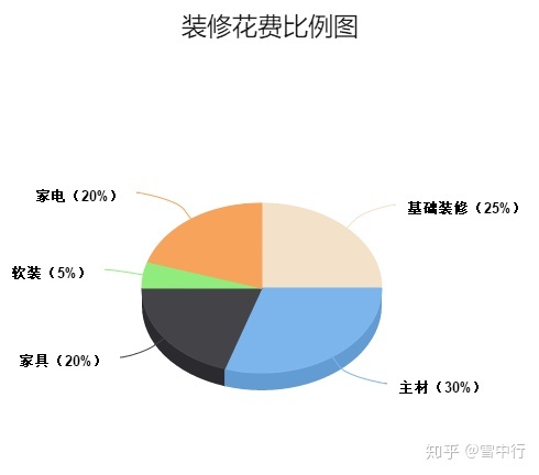裝修費(fèi)用由基礎(chǔ)裝修部分、主材部分、家具部分、家電部分、軟裝部分組成,五大項(xiàng)目最合理的資金分配分別為:25%、30%、20%、20%、5%。
