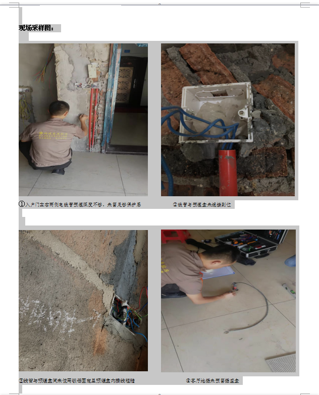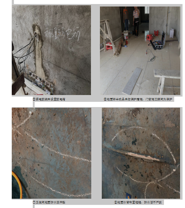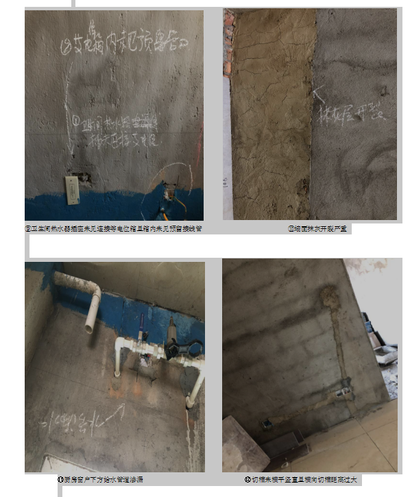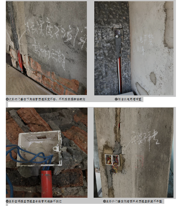 【本期泉州家裝驗(yàn)房:安溪仙景苑的家裝水電節(jié)點(diǎn)質(zhì)量驗(yàn)收現(xiàn)場(chǎng)】,根據(jù)業(yè)主介紹,驗(yàn)房師了解到很多問(wèn)題。一.本次裝修合同原先說(shuō)是以裝修公司名義簽,而后變成個(gè)人簽訂裝修,合同保障性差;二.合同報(bào)價(jià)14萬(wàn),局部主材(瓷磚,門(mén)窗)未包含,付款方式(第一筆合同簽好預(yù)付50000元;第二筆水電排線(xiàn)完成后預(yù)付30000;第三筆工程進(jìn)度過(guò)半預(yù)付30000;第四筆工程進(jìn)度過(guò)80%預(yù)付25000;第五筆竣工驗(yàn)收后付3000;第六次六個(gè)月保修期后付2000)驗(yàn)房師發(fā)現(xiàn)關(guān)于裝修節(jié)點(diǎn)界定非常多的貓膩(1.水電未提完工而是以排線(xiàn)完成來(lái)替代差距很大;2.未能界定進(jìn)度50%、80%的具體參照,后期業(yè)主容易吃虧)。因裝修公司在水電裝修環(huán)節(jié),施工手藝較差 現(xiàn)場(chǎng)混亂 導(dǎo)致業(yè)主非常不滿(mǎn),所以邀請(qǐng)愛(ài)屋驗(yàn)房進(jìn)行第三方水電節(jié)點(diǎn)質(zhì)量驗(yàn)收,現(xiàn)場(chǎng)讓人觸目驚心 匪夷所思!如下圖所示