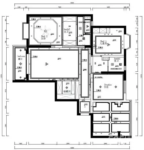 不能光有天花布置圖哦,天花尺寸圖也不可或缺。這張圖上要標示每個具體吊頂制作的長寬尺寸,燈具安裝的具體位置。