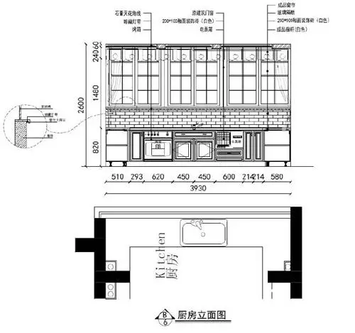 繼續(xù)以上面廚房立面為例,下面是廚房里的4個立面圖紙。最好在每個房間都有這樣的立面示意,有些現(xiàn)場打的柜體還需要有內部示意。