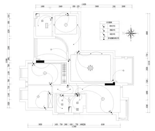 這張圖會標示出每個區(qū)域的開關布置情況,注意有些區(qū)域要用到雙聯(lián)雙控開關(比如進入臥室有控制臥室頂燈的開關;床頭也會有控制這個頂燈的開關,方便睡覺前直接關燈不用起身)。
