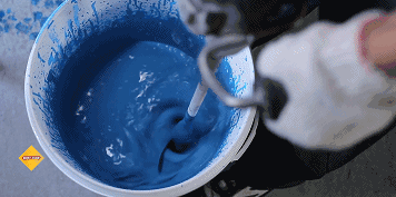 ▲防水涂料請務必攪拌至均勻!涂料配比為1:4,不用加任何溶劑,直接將兩個組份不斷攪拌到糊狀就可以了。調(diào)好以后,直接將防水材料均勻即可。